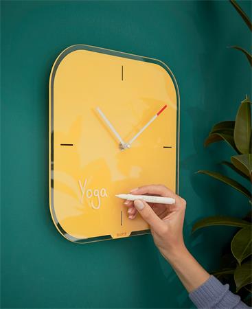Modern, minimál stílusú, üveg falióra, tollal a találkozók időpontjának feljegyzéséhez.