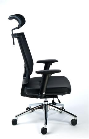 Exkluzív fejtámaszos irodai szék, fekete bőrborítás, feszített hálós háttámla, alumínium lábkereszt, MAYAH "Maxy"