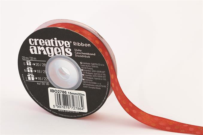Szatén szalag, 15 mm x 22 m, piros vegyes pöttyökkel