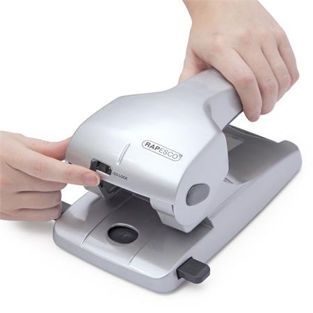 Lyukasztó, nagyteljesítményű, kétlyukú, 65 lap, fém, RAPESCO "Zero 65", ezüst
