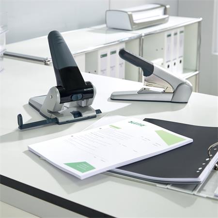 Lyukasztó, nagyteljesítményű, kétlyukú, 65 lap, LEITZ "5180", ezüst