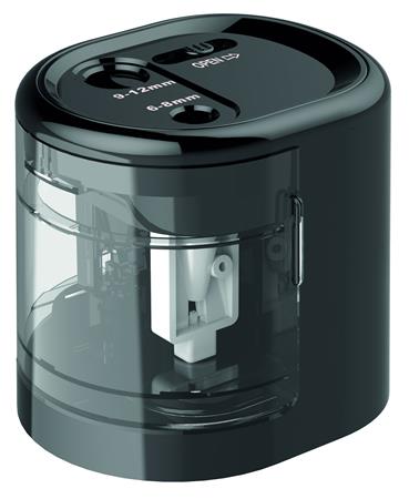 Hegyező, kétlyukú, asztali, elemes, USB töltővel, RAPESCO"PS12-USB", fekete