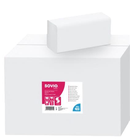 A Sovio "V" hajtogatású kéztörlő kiváló minőségű, puha papírtörlő, mely erős nedvszívő képességével ideális megoldást kínál nagy forgalmú mosdókba, éttermekbe, intézményekbe.