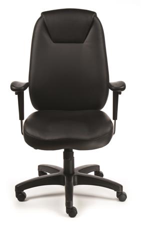 Párnázott főnöki fotel.-extra komfortos szivacsozás-ergonomikus támlakialakítás-kényelmes fejtámasz-gázliftes magasságállítás-több ponton rögzíthető szinkronmechanika-állítható karfával szállítjuk-kárpit:bonded bőr-szín: feketeméretek: teljes magasság: 110-120 cm ülésmagasság: 43-55 cm ülésmélység: 50 cm ülésszélesség: 55 cm-teherbírás: 135 kg