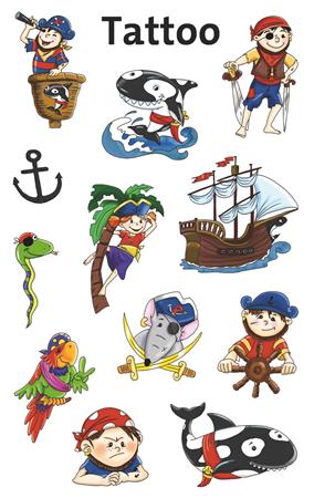 Kalóz tetoválás kis kalózoknak! Lepje meg gyermekeit nagyszerű tetoválásokkal, gyermekei imádni fogják a vicces kalóz tetoválást. Tökéletes ajándék, vagy apró meglepetés, amivel hazaérkezik, születésnapi partikra vagy egyszerűen arra, hogy a gyerekek játszanak.