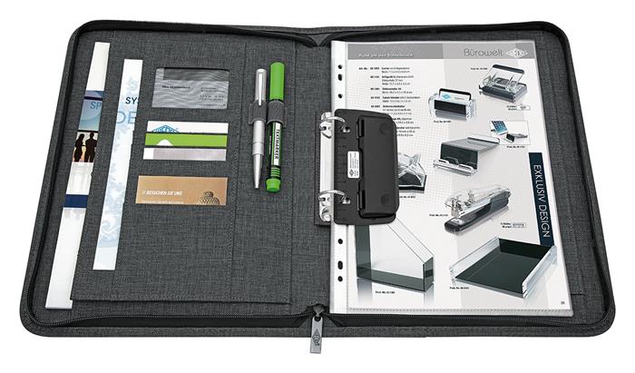 sok zseb és rugalmas, gumírozott hurkok biztosítanak helyet kártyák, tollak és kiegészítők számára