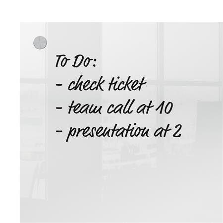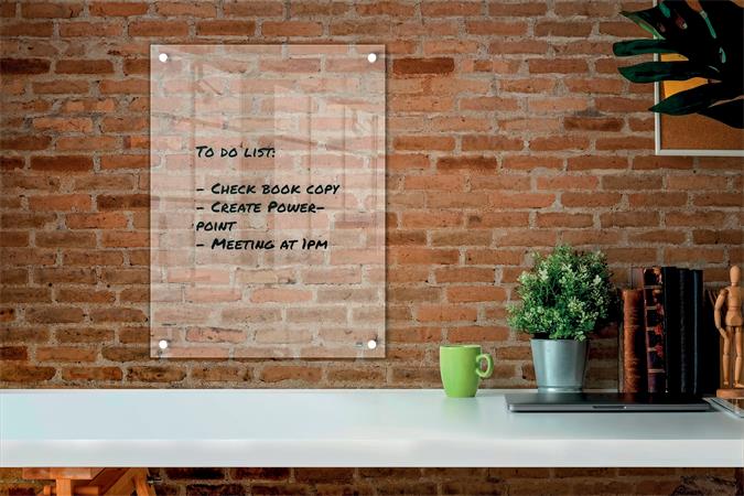 A sarkokon keresztül falra szerelhető és az átlátszó kialakításnak köszönhetően észrevétlenül beleolvad a környezetébe, amikor nincs használatban. Könnyen tisztítható felület; egyszerűen írjon rá és törölje le.