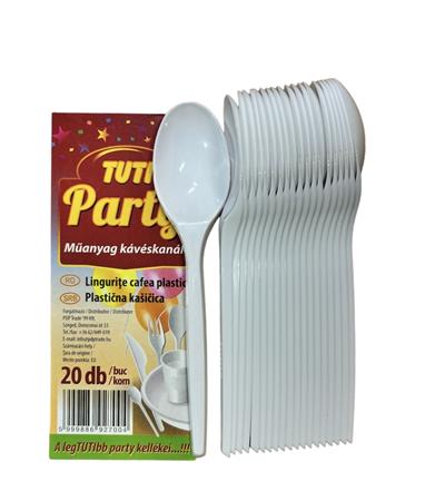 Fehér, műanyag eldobható kávéskanál, kerti partik, büfék és fesztiválok elengedhetetlen kelléke.